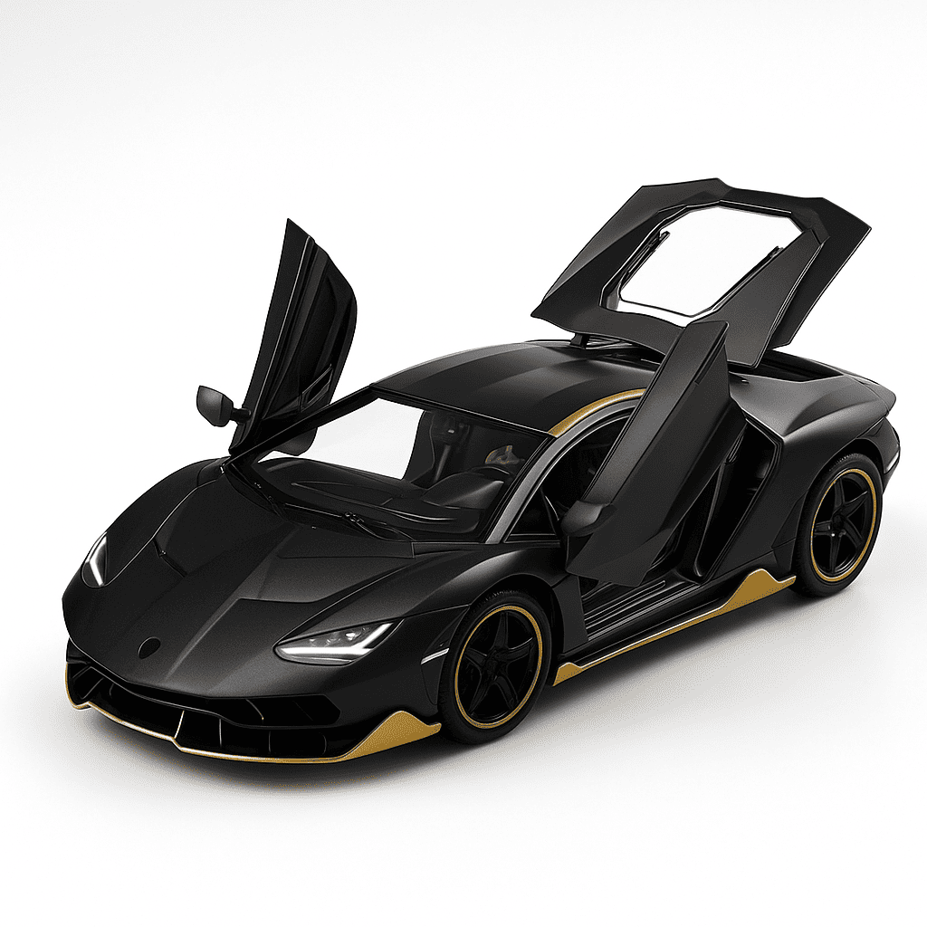 Experience the elegance of performance with the die-cast supercar — crafted in matte black and gold, featuring functional doors and a detailed interior that captures the spirit of high-end automotive luxury.